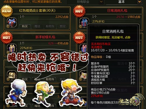 龙之谷游戏内点券商城开张啦!精美的属性时装、个性的染色道具、便捷的功能道具等等,内容丰富可谓是一应俱全。同时为庆商城开业,三大优惠大礼包疯狂热卖中,道具多多,优惠多多,千万不要错过喽。