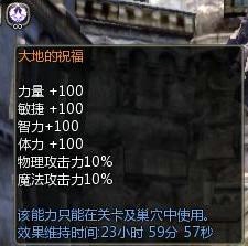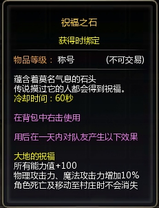当右键点击背包中的“祝福之石”时,BUFF栏会出现如上图所示的∞的标志,此刻便得到了“大地的祝福”:各能力值加100,物理攻击力和魔法攻击力各加10%,效果维持时间达到整整24小时!而最为令人振奋激动恨不得拿起小号角向所有认识的不认识的人摇旗宣告的是:这份“大地的祝福”,不仅是大地之神给予自身的祝福,更能惠泽到队友!也就是说,凡是跟拥有“祝福之石”的角色组队的玩家,只要拥有者右键使用这块神石,各位队友均能享受到同样的“祝福”:所有能力值+100,物攻/魔攻各+10%!