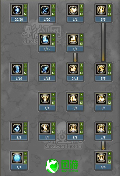 箭神页,辅助以及逃生技能诸如三角虚晃,精瞄和瞄准,弓掌自然是必满,放逐因为几乎没用而被放弃。怒气每加一点多0.5秒捆绑时间自然应该加满,震裂箭100%眩晕出一点。输出技能方面,飞空连射配合EX长时间滞空且命中率高可以尝试点满,追踪箭在天梯中的犀利自然不必多说,虽然被削弱,但难以有效防御是它的最大优点。聚能配合EX,伤害高,距离长,但释放速度太慢只能配合怒气使用,建议EX前置,40大自当选择机关枪,掉毛箭同样因速度慢,易被躲而放弃。在其他输出技能中,集中,迅捷,追风,以集中最易命中目标且无需近身成为首选,当然也可以试着点高包围,包围的效果自然是谁用谁知道,不过一点却是也够了。