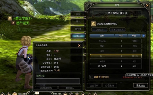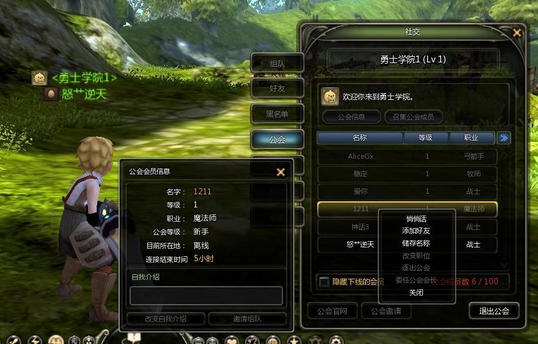 勇士学院跟普通的公会一样,可以选择公会成员查看信息状态,私聊,存名字,添加好友等,只是木有公会会长和副会长等职位之分了,所有成员一律平等。