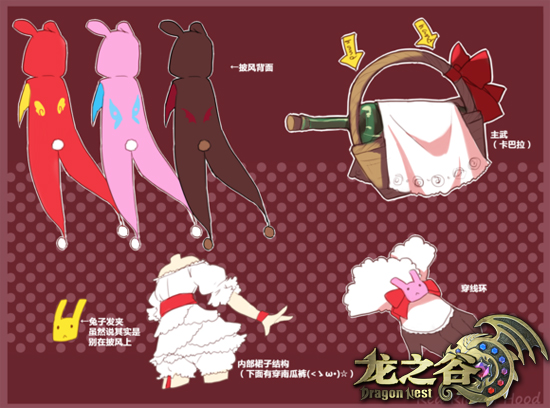 第一届时装设计比赛的优胜者“商鸮”再次如约参赛,之前绘制的扑克风时装已经在《龙之谷》两周年庆典正式植入游戏。玩家设计第一套游戏时装极具意义,“商鸮”将扑克牌的不同花色融入时装的理念既创新也具有欣赏价值。“商鸮”这次带来了兔耳披风加小洋装的混搭设计,有没有很像去看望外婆的萝莉小红帽?背面细节更加趣味哦,这难道是网上正流行的连体毛绒睡衣?!