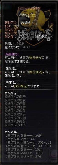 为什么我会首先提到它呢,因为在我看来,这个套装,,它没有那么明显的界定,物理魔法一肩挑的属性,其实更让我想起S的装备。这个套装,稍微显得有那么点不伦不类,那么,它的存在是为什么呢?某人说过,存在就要意义,所以我理所当然的认为,固执套,也是有它存在的意义的。它没有明显的物理或者魔法的偏向,但是致命一击加成最高,体质也最高,就是说,它适合双修的,需要提高致命一击的职业,并且,它的套装属性带来的的血多,对于某些特定的需要提高生存率的副本,或许是一个不错的选择。(啦啦啦,说句题外话,我个人其实觉得固执比较适合混搭啦~)