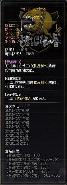 哦,在危险套装上,我们能够很明显的看出来,这是一款适合物理攻击的职业的套装,如果你穿上一身危险套装,那么你可以额外提高多少物理攻击力?我们简单算一下,在集齐3件时,可以让上下限提高359,在七件时,再次提高502,相加等于861,相对于固执套装的301,足足多出560点。危险盼望套装,可以说是为物理职业量身定做的套装,如果你是物理职业,可以好好考虑一下,是不是穿一身危险呢。