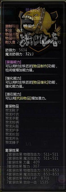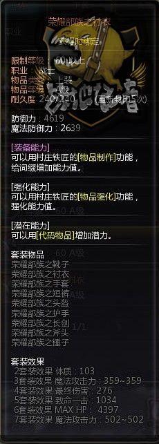 为什么我说是与危险套相对应呢?让我们来看套装效果,啊哈,你会发现把危险套装的效果中的物理改成魔法就可以了。这是一套适合魔法职业的套装。鉴于上面对危险套的描述,这里对荣耀套就不再多说了,把上面对危险套装的简绍,稍稍对应一下就好了。