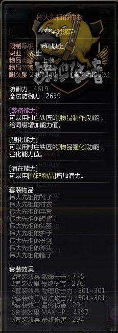 伟大先祖套装,和固执有点像,一样是物理魔法一肩挑,但是,它却可以说是现在,60A里最好的了,因为它带给你的,号称是土豪属性的,最终伤害属性。算了一下,伟大七件,全部穿起来,能够给你864点最终伤害,虽然比起荣耀危险,少了560点的攻击力,但是,并不亏,不是吗?