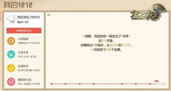 与《龙之谷》陪伴玩家的2年多时间相比,淘宝已经存在了十数年,陪伴各位的时间也更长。因此,淘宝时光机能挖出的“黑历史”也就更多。而淘宝的时光机更像是一个记账本,记录着买家网购以来的点点滴滴。第一个网购的物品,快递的包裹经常送往哪里,就连收过的包裹总数都能详细列出。不少买家在看到了自己的时光机记录之后,纷纷陷入了“是不是该砍手”的阴郁之中,谁让网购如此方便呢,花钱如流水啊!