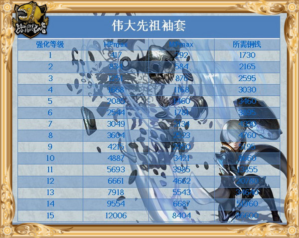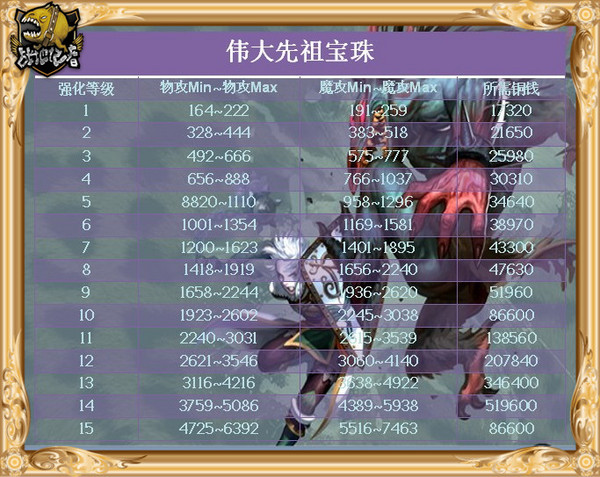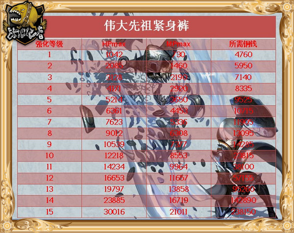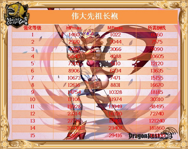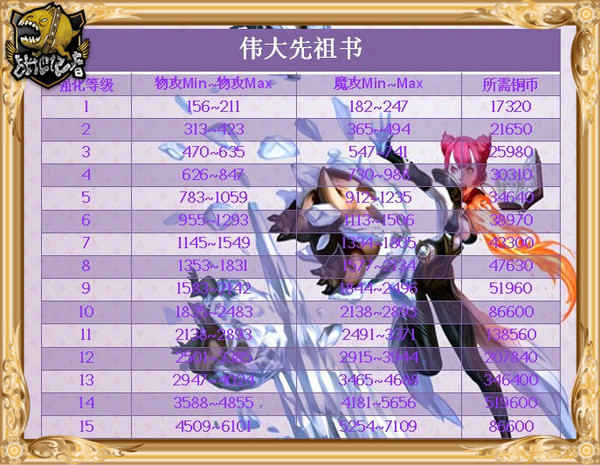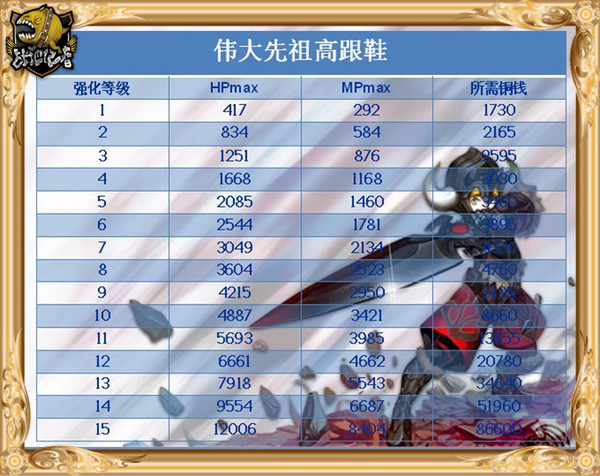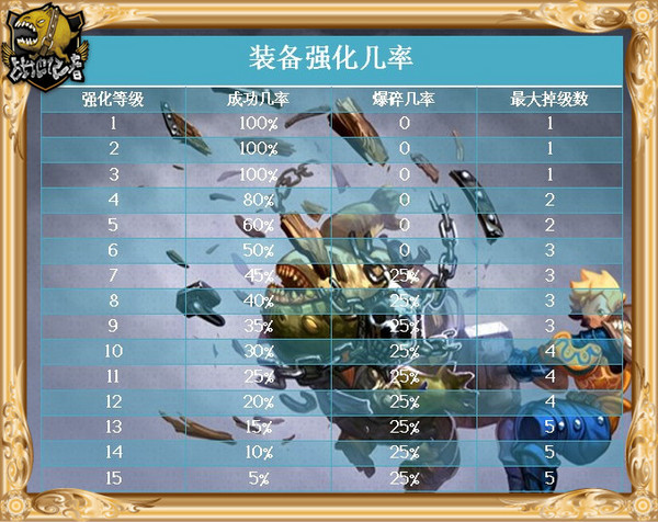 在宝石与金币数量足够的情况下,玩家自然可以去让人又爱又恨的铁匠处进行装备强化。强化装备本身不是一件难事,难的是如何让让准备可以强化成功,而又不被铁匠爆掉。强化到15更是一件极其需要勇气魄力毅力的巨大工程。下面为玩家列出各种等级的装备强化时的部分数值。