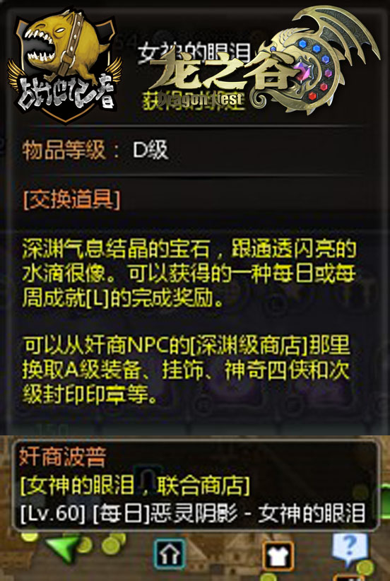 装备从高到低分为L、S、A、B、C级装备,因为在龙之谷中A级装备的获得渠道并不算苛刻,所以一身A级装备的角色并不像其他游戏中那么难以见到,目前60A的装备大致上分为2类,套装以及非套装,非套装的60A装备在王城近卫兵劳尔那里接取的每日任务后要求通关的奇迹祭坛保护区、狂人研究所、伊戴尔基地和泰努阿尔神殿这四个副本的深渊模式或者60级巢穴,K博士巢穴、台风金巢穴里可以打到,如果运气不好也没有关系,从神圣天堂的奸商波普那里可以接取每日女神的眼泪任务,可以通过女神眼泪从奸商波普那里换得,以及王城近卫兵劳尔处接取的每日任务完成获得女神的气息之后从黑暗女神官摩卡那里获得也是一个不错的选择。
