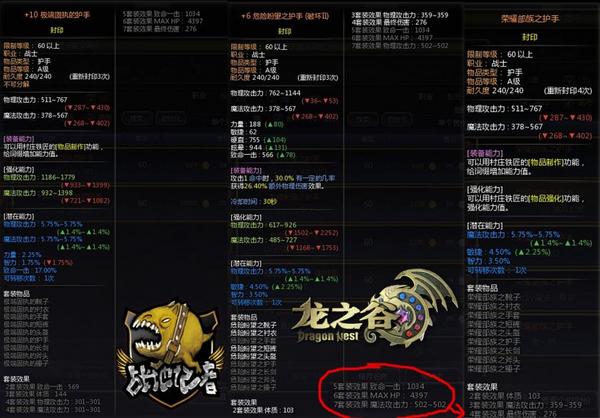 拿3种套装的战士副武器--护手为例,上图可以全面解释之前所说的各方面提升装备重要性,未强化未添加词缀的荣耀部族护手和未添加词缀的+10极端固执护手基础面板都是511-767物理攻击力,378-567魔法攻击力,仅此两个属性,而添加过二级破坏词缀的危险盼望护手全面提升了物理伤害,拥有高达1144的物攻,还有力量、敏捷、硬直、眩晕、致命等额外属性的添加,更是拥有攻击命中时有30%的概率获得26.40%额外物理伤害的效果,从基础属性来看,危险护手拥有了词缀完爆另外两者,而从强化属性来看,未强化过的荣耀部族护手没有强化能力项,+6的危险盼望护手强化能力为617-926的物理攻击力和485-727的魔法攻击力,而+10的极端固执护手的强化能力则更高了!拥有1186-1779的物理攻击力和932-1398的魔法攻击力,相比+6的装备之下+10的装备强化能力近乎翻了一倍!而且随着强化等级的提升,每一个强化等级的加成还会逐步增加!所以附魔,词缀和强化系统是相互独立的,只有3个都做好了才可能最大限度的提升自己的实力。