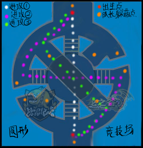 圆形竞技场是很自由的一张图,我只是标出来三条主线,其他的路线可以根据自身情况变换进攻路线,比如①线②线可以断开,将①线②线变换着走都是可以的.包括自身有能力的游侠系可以跳悬崖到桥上袭击,以及各种远程职业可以根据地形发挥自己的能力.