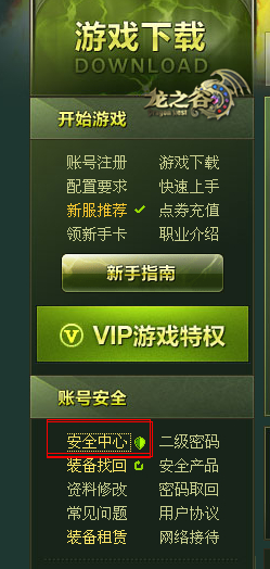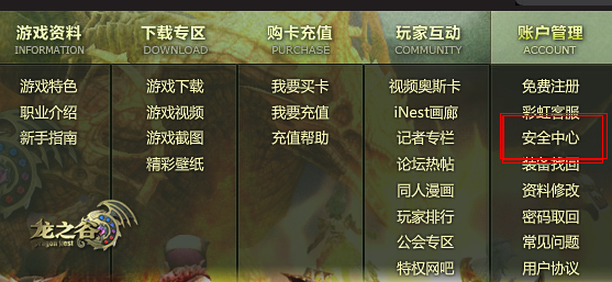进入入口仍然与老版安全中心相同,可以选择《龙之谷》首页左侧“帐号安全”栏目内的“安全中心”,也可以通过首页顶部导航条“账户管理”中的“安全中心”后进入。