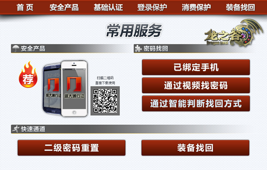 在新版《龙之谷》安全中心首页上,将大家常用的一些功能直接列明,包括提高帐号安全的免费安全产品“盛大通行证手机版”,各种不同的密码找回方式,二级密码重置页面的快速链接,还对装备找回的操作流程进行了引导。