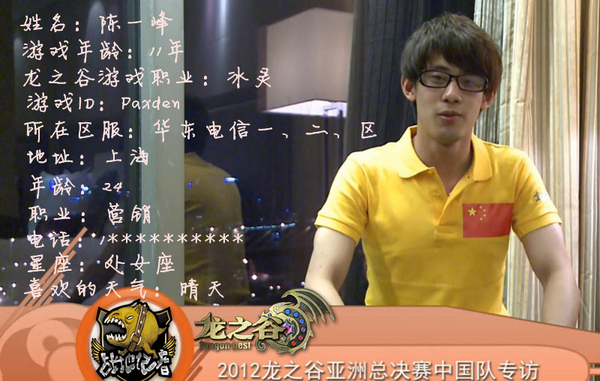 “我热爱游戏,热爱PVP,龙之谷的PVP打击感很强,人设也非常多样化。打游戏我获得过亚洲杯中国队四强,元素吧内战冠军,WCG上海赛区16强。平时我的兴趣爱好就是上网和吃饭,最大的梦想是成为职业玩家……可爱萌的女孩让我难以抗拒,今天我要牵手最萌小龙妹!”