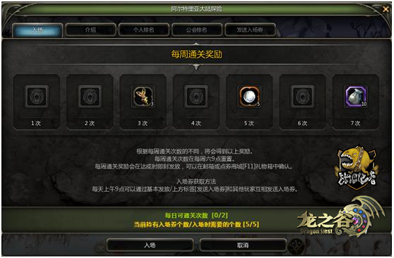 第一栏是角色在一周内通关大陆探险的累积次数,累积到特定次数将会有一定的奖励;在“介绍”标签中,列举的是大陆探险中可产出的各种道具;“个人排名”和“公会排名”则根据通关大陆探险的金钥匙数量进行排名,其中,“个人排名”还会依据通关时间的长短排列名次。目前,《龙之谷》中阿尔特里亚大陆探险每天可通关两次,当“入场”按钮亮起,表示余票充足,入场口被激活;反之,当“入场”按钮呈灰色不可点击状,则代表余票不足,或者当日可进入次数已被消耗,此时,则需要等第二日通关次数重置后,方能入场咯。