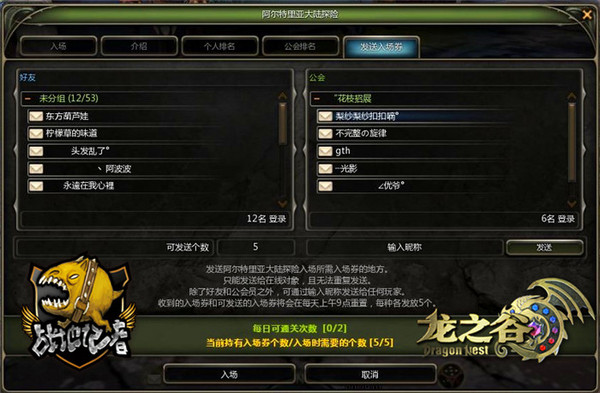 值得注意的是,每次进入大陆探险需要5张入场券,除了系统每天一次性发放的5张外,通过集齐他人赠送的另外5张入场券,才可以获得第二次入场机会。如上图所示,在“发送入场券”标签中,选择自己的好友或者公会的朋友发送(亦可以自行输入角色名称进行发送),每天可以给不同的角色发送5次。名字左侧信封为明亮的是可接受赠票的角色(入场券仅支持发送给在线的角色),点击发送后,好友就收到了,同样,好友也可以向你发送入场券。当集齐5张入场券时,便可以进行当天的第二次探险了。