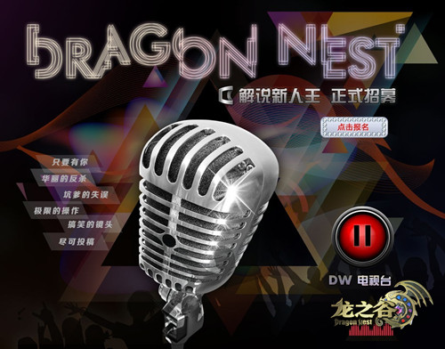 下一站天王天后就是你!《龙之谷》解说新人王火热招募中,只要你对自己的解说实力有信心,你就能来参赛。不仅有机会成功登陆DN电视,更有机会赢得幽灵战马等豪华奖励,还不快来参赛!