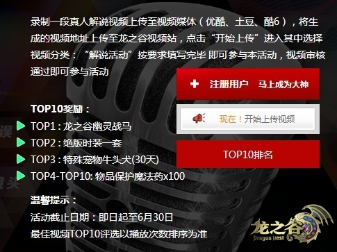 怎么能让好解说员默默无闻至今呢?《龙之谷》举办解说新人王大赛,招募才华横溢的解说高手共襄盛举。想要报名参加的玩家需要录制一段真人解说视频上传至视频媒体(优酷、土豆、酷6),将生成的视频地址上传至《龙之谷》视频站并按要求填写完毕即可,一旦视频审核通过即被认为正式参与活动。活动视频面还有机会出现在DN电视台中,让你的名字成为家喻户晓的存在!