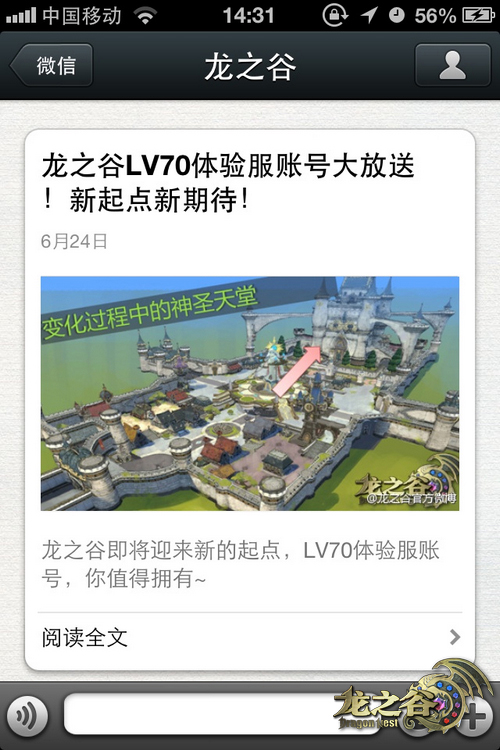 除了微博之外,《龙之谷》在微信平台上也开放了体验服账号赠送的活动。在6月24日-28日期间,回复“我要战70级测试服”即有机会获得体验服账号,无需@好友也无需花费大精力,短短十个字不到的内容就有机会获得“体验服录取通知书”。每天20个体验服账号免费送,精彩一夏轻轻松松!