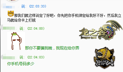 在玩家需要出售账号的时候,骗子又来了,他会通过各种理由索取玩家的账号手机绑定,卖萌套近乎各种招,说更换手机绑定之后再给你打钱或者金币什么的。然后骗子要取到手机绑定之后,立马改玩家的账号密码什么的,然后逃之夭夭。