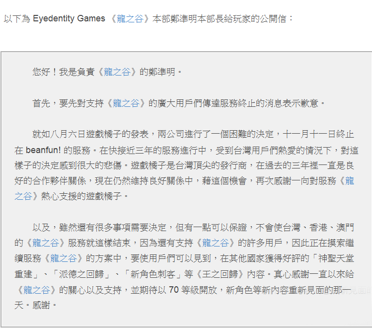 《龙之谷》原厂Eyedentity Games 关切台港澳玩家的反应,今日特别透过巴哈姆特GNN 发表给玩家的公开信,