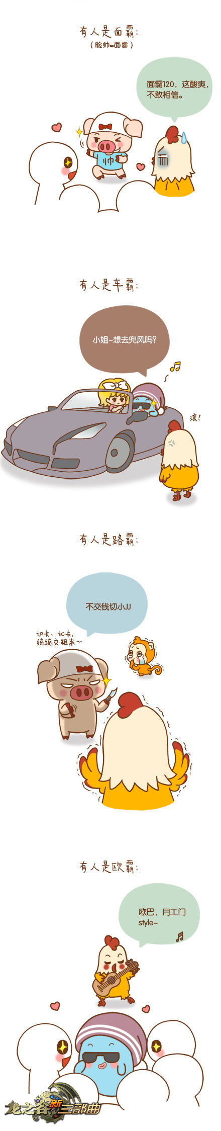 这个世界上有很多霸,有人是学霸,有人是面霸,有人是车霸。那么郭斯特最想成为什么霸呢?3D清新竞技动作网游《龙之谷》大人物账号活动正在火爆进行,各种奖品疯狂派送。其中,红遍网络的土豪金iphone5s就成功吸引到郭斯特的钛合金鸡眼。为了得到这只大人物的标配神机,它变身刺客来了一场豪取掠夺。想知道鸡霸是怎样炼成的吗?请看《龙之谷》最新创意漫画!