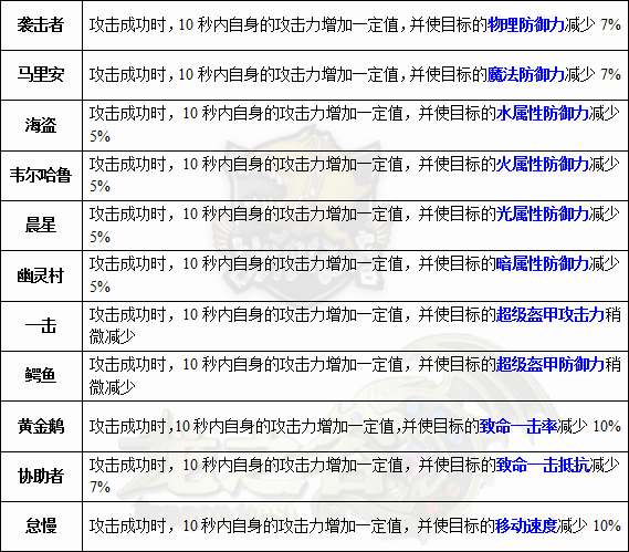 当前共有22种技能龙玉,武器类11种,防具类11种,各占一半。表1和表2中所展示的,分别为武器类和防具类的技能龙玉。