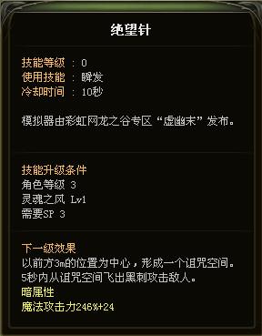 此技能笔者觉得作为刷图的加点来讲,完全是可以不点的。虽然在敌人落脚点发动是有一定几率将敌人打硬直,但是我们在关卡巢穴中面对的怪物,是大多不可能一直停留在原地的。所以绝望针虽然是魔攻的暗系技能,但是攻击效果伤血不高,还作为原地持续性技能显得十分鸡肋。而且受到地形的影响,有时候会出现已经丢出技能却不能出现地刺的情况。