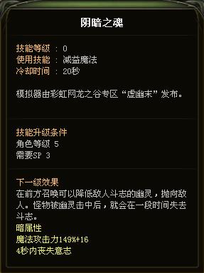 可能有些玩家不懂让怪物丧失斗志的意思,在这里笔者做个简单的介绍:所谓让怪物丧失斗志,就是中了阴暗之魂的怪物会在4秒内产生斗志低落从而不攻击你,有几率击开和打晕身边的怪物。这个技能清小怪比较给力。
