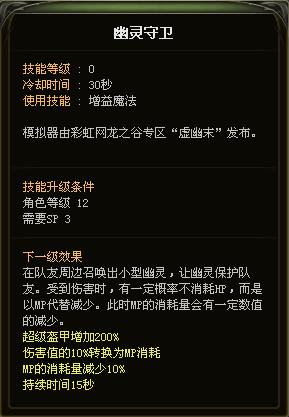 既然是刷图点,所以建议大家把MP盾技能点满,在这个新巢穴的怪物都是攻高,且全屏技能超多的时期,幽灵守卫以MP代替HP减少,同时增加防御力,大大增加了自己和队友的生存几率。MP盾点满后是持续时间25秒,冷却时间30秒,除去其他因素,身上有MP盾的时间是非常长的。