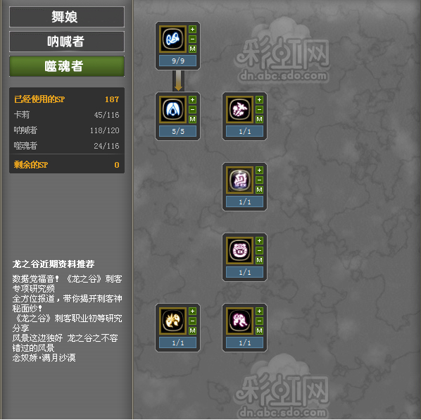 噬魂者页面,笔者将技能全部都加满了,除开盘蛇EX和灵魂之门EX是不消耗SP点数的,其他技能共消耗了24点SP。