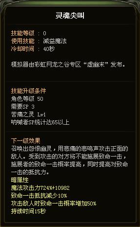 从灵魂尖叫的攻击效果,我们可以看到,给怪物的致命一击抵抗直接是减少10%(满级是20%)。然后是攻击敌人时致命一击概率增加50%!(满级是60%)。这个致命一击的概率增加,对于高致命的职业是非常不错的辅助,可以打出的伤害也非常高。