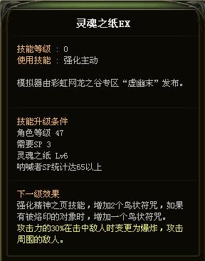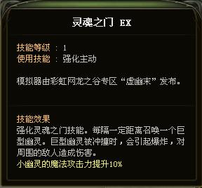 同样的,我们可以看到灵魂之门EX同其他EX一样,增加了原技能的伤害值,增大了技能本身的伤害范围。再加上也不需要SP点数,所以每个玩家都会点击学习。在学习了灵魂之门EX后,原本蓝色的灵魂之门会变成红色的灵魂之门,看起来霸气了许多。(笑……)