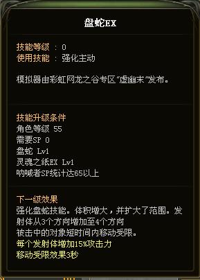 最重要的一点在于是"移动受限制的效果增加3秒"。是的!增加3秒!让我们来回顾下呐喊者页面的加点:笔者于盘蛇技能点的是6级,所以效果为减少诅咒对象40%的速度且持续时间6秒,这个再加上盘蛇的EX效果,给BOSS减速的效果就变成了9秒。最为重要的一点,此技能的点击不需要SP点数,所以肯定是必点的。