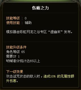 作为65级的被动技能,伤痛之力还算是中肯的被动。给噬魂增加了10%的无属性攻击。不过大家需要注意的一点:伤痛之力的发动效果在于攻击诅咒状态的敌人时,造成10%的无属性额外伤害。是说明只有已经收到了诅咒状态的敌人,在被攻击后,伤痛之力才会造成10%的无属性额外伤害。如果是面对没有受到诅咒的敌人,这个被动技能伤痛之力是没有额外的伤害效果的。