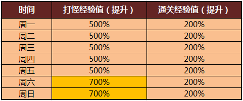 活动期间,周1~周5打怪经验值提升500%,周6~周日打怪经验值提升700%;活动期间通关经验值提升200%
