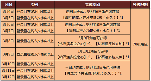 3月8日-3月9日,每天登录游戏并且在线达2小时或以上,次日可获得【钻石潘多拉之心】*1,【钻石潘多拉火种】*1